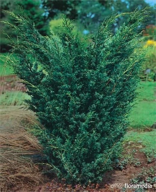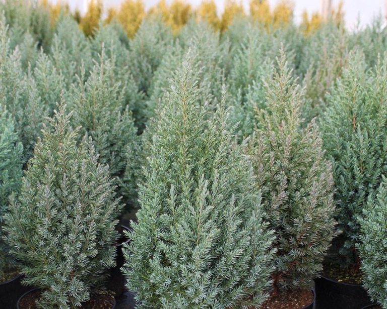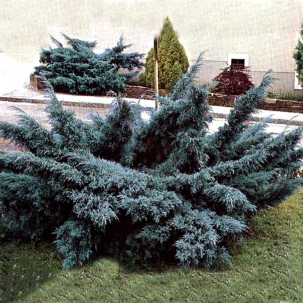 Можжевельник китайский Блу Пойнт (Juniperus chinensis ‘Blue Point’): пирамидальной формы; 12 футов в высоту и 8 футов в ширину; густо разветвленный.
