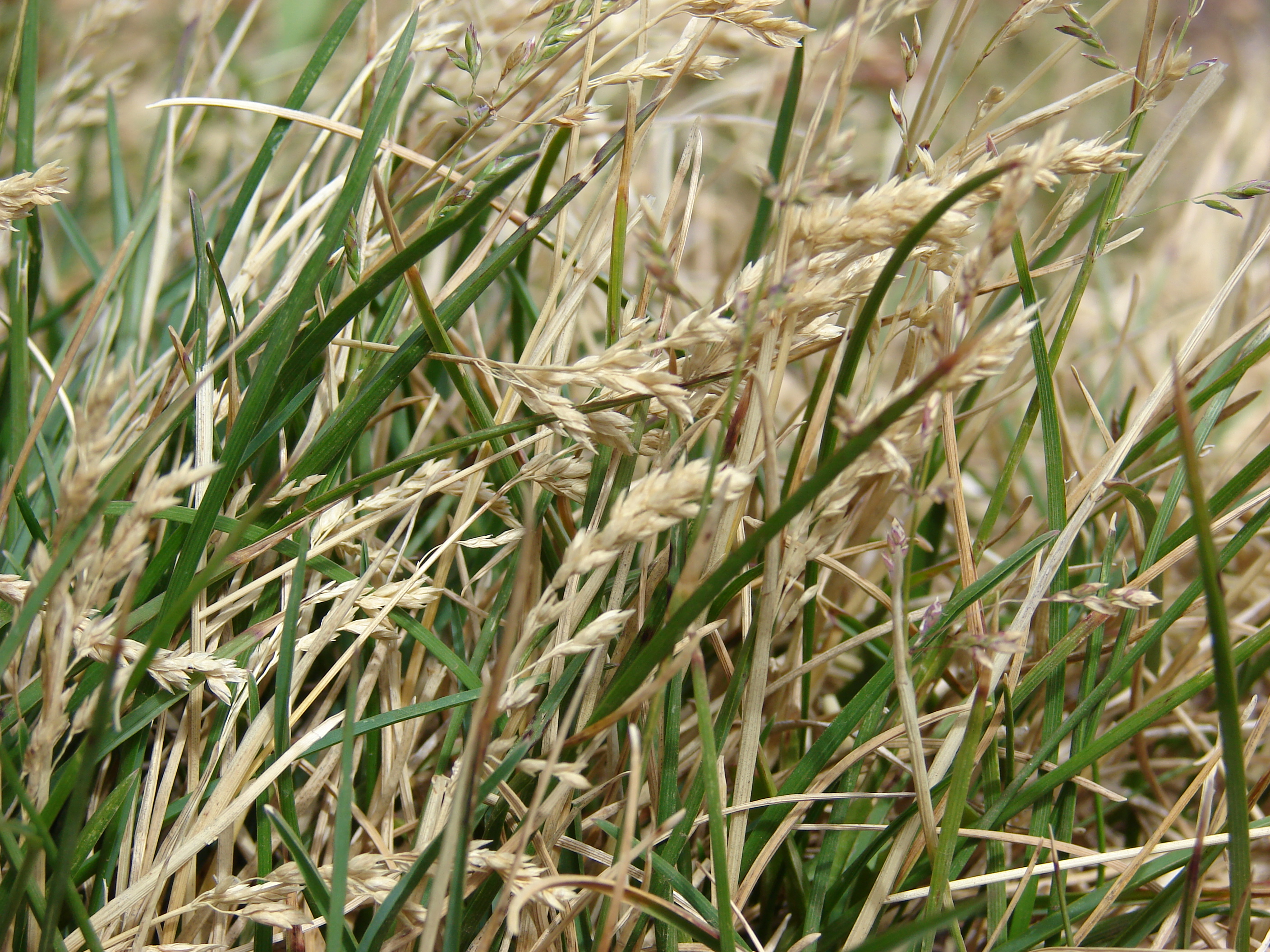 Мятлик грубостебельный (Poa trivialis), светло-зеленые участки на жилом газоне. Фото: Мири Талабак, дополнительный