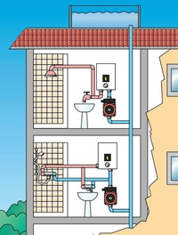 В многоквартирном доме подкачивающие насосы обычно используются для заполнения больших напорных баков, после чего вода под действием силы тяжести течет из бака в каждую из квартир. В доме они помогают повысить давление воды до определенной точки, например, до ванны (обычно подключаемой под ванной).