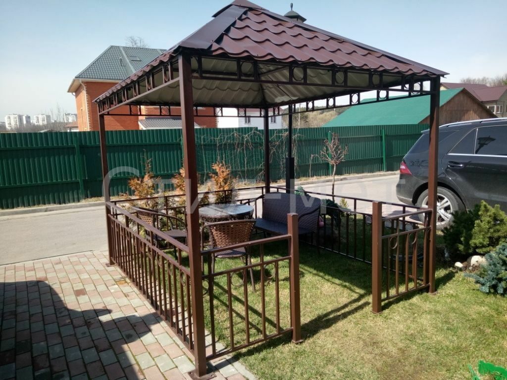 Сам навес получается уютным и удачно вписывается в любой уголок сада, ведь обычно расцветки гонтов делают по мотивам природы: