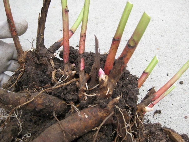 Самое же главное — глубина посадки. Почки возобновления должны быть утоплены в землю на 3–7 см. При более глубокой посадке пион не зацветёт никогда! И, наоборот, мелкая посадка ослабляет куст, он часто болеет, в результате чего цветение также остаётся под вопросом. Кроме того, при посадке нельзя высаживать очень крупные делёнки (оптимально — 3–5 крупных почек возобновления и столько же придаточных корней).