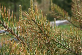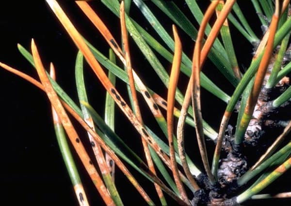 - Пихта и можжевельник. Хвоинки деревьев приобретают бурую или грязно-жёлтую окраску. Обычно первые признаки проявляются в начале июня, при этом сначала страдает прошлогодняя хвоя. Уже ближе к осени на иголочках образуются чёрные круглые точки, которые содержат споры грибка, являющегося возбудителем заболевания.