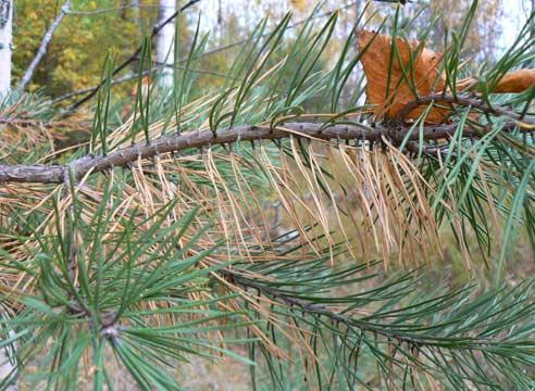 Обычно признаки этой формы заболевания заметны уже ранней весной. Изначально на иголочках деревьев появляется чуть заметный налёт, но со временем он приобретает бурый цвет. Далее хвоя начинает обильно опадать, и если не предпринять быстрых мер борьбы, то дерево может погибнуть.