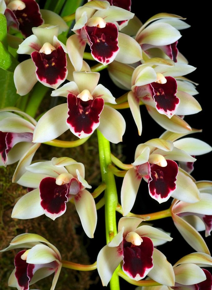 Эффектно смотрится прямой цветонос цимбидиума, который буквально усыпан крупными цветками. Цветение длится около 2-3 месяцев. Цвет лепестков от нежно-кремовых и желтых оттенков до бордовых и фиолетовых.