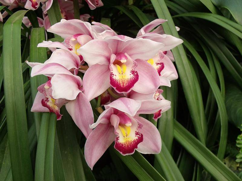Здесь, в Южной Калифорнии, очень хорошо растет орхидея-лодочка Цимбидиум. Эти виды орхидей выращивали и изображали в рисунках и стихах более двух тысяч лет со времен Конфуция. Они по-прежнему популярны сегодня из-за больших, эффектных и долговечных цветов. Розовые, желтые, зеленые, красные, коричневые, персиковые или комбинированные цветки также прекрасно сохраняются в срезанном виде — если вы ежедневно меняете воду и обрезаете нижнюю часть колоска, они могут выглядеть нетронутыми в течение месяца или двух в вазе.