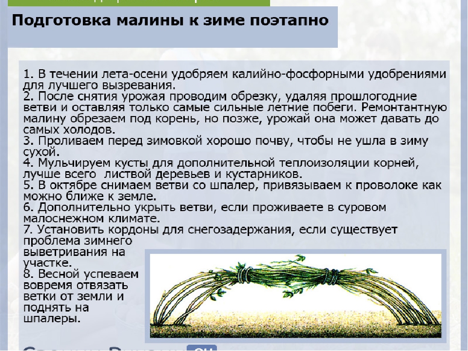 Осень — оптимальное время для обработки.Летом выращенные растения получат больше питания и солнца, а у старых вредителей на зиму не останется. Не откладывайте работу до заморозков; В теплую сентябрьскую погоду в зарослях развиваются болезни и находят приют насекомые, например, стеблевая галлица малины. Опытные садоводы приступают к обрезке малины сразу после сбора урожая — в августе или в начале сентября … Растения в солнечные дни накапливают максимум питательных веществ для наступающей весны.