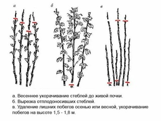 Сначала удаляем засохшие, сломанные, больные стволы. Затем наступает очередь двухлетних побегов — они темные, с очищенной корой. Удалите столько старых стеблей, сколько оставите молодыми и здоровыми. Срезаем их до земли, не оставляя пней: в них могут завести вредители. Срез обжигаем, иначе личинки и насекомые хорошо перезимуют под снегом.Удаляем мелкую зелень, зимой она еще погибнет и станет рассадником болезней. Обрезаем концы молодых веток, высоты достаточно полутора метров.