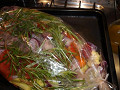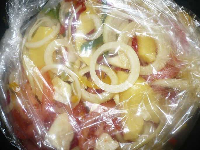 Осталось пару штрихов: уложите овощи в глубокую чашу — посолите, добавьте специи по вкусу и оливковое масло 3 ст.л. Всю смесь тщательно перемешайте и переложите в подготовленный рукав. Рукав завязать с двух сторон специальной лентой (как конфету), края пакета подвернуть вниз — чтобы они не касались нагревательных элементов духовки. Сделайте 3-5 проколов зубочисткой в верхней части, чтобы не было полного «парового эффекта». Уложите рукав на противень. Теперь он готов отправиться в разогретую духовку минут на 30-35 при температуре где-то 200 градусов.4Вынимаем рукав с овощами.