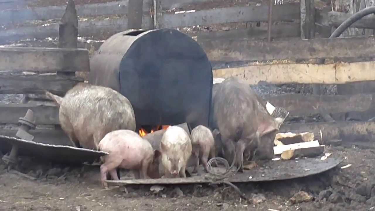 Дымоотводная труба проходила посередине большей трубы, которая была баком, потому вода очень быстро закипала. Буквально охапки сухих сучков хватало, чтобы вскипятить около 50 литров воды. Пробовал варить каши и просто запаривать корма — разницы особой не заметил. Преимущество такого корма в лучшем усвоении питательных веществ. Кто бы что не говорил, но усваивается запаренный корм в разы лучше. При том же расходе корма свиньи выглядели более упитанными, съедали весь корм с аппетитом. Использовалось мокрое кормление — набирал пол ведра каши и заливал до полна водой, вываливал в одно корыто. По сравнению с сухим кормлением сырости в клетках больше, но кала гораздо меньше. Лучше усваивается корм = меньше выходит из организма.