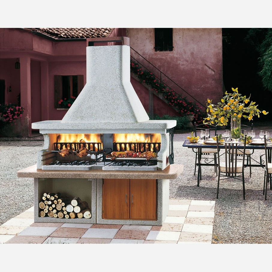 По сути, уличный камин — это разновидность барбекю с грилем . Его функциональность ограничивается приготовлением мяса и рыбы. Но у этого варианта есть преимущество перед русской печью: для установки прибора потребуется совсем немного места. Это идеальный выбор для небольших дачных участков.