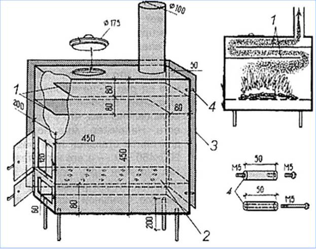 - листовый металл толщиной не менее 4 мм для создания дымохода, корпуса и дверцы;