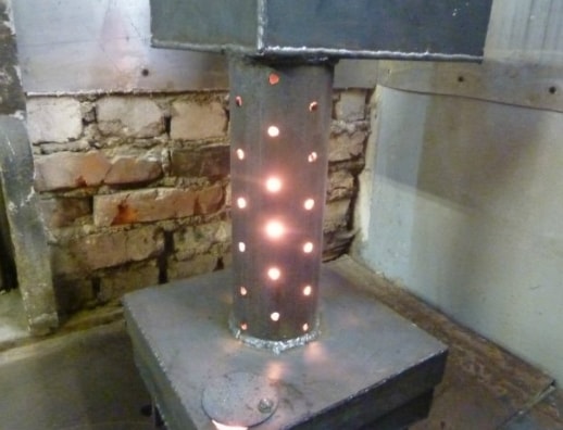 В первый корпус вставляют трубу, по которой газы будут поступать вверх во второй корпус. Это труба — толстостенная. На ней будет крепиться вторая камера. Корпус второго уровня сделан из толстостенного сплава. Иначе он быстро прогорит под воздействием высоких температур. Вверху 2 камеры вырезают отверстие для дымохода. Сырьем для тепло-генератора будут все нефтепродукты: солярка, отработанное масло, керосин и многие другие виды. Не следует в такой топке сжигать легко-горючие составы. Бензин, ацетон, растворители при небрежном отношении станут причиной серьезного пожара в хозяйственном блоке. Такие вещества стоит использовать только для розжига основного топлива, в небольших количествах.