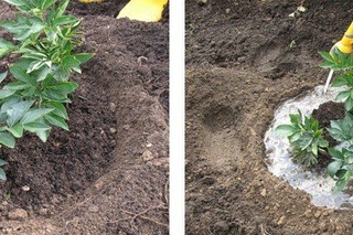 Деленку засыпают землей и немного уплотняют почву вокруг будущего кустика. Саженец после посадки поливают водой с добавлением стимуляторов роста.