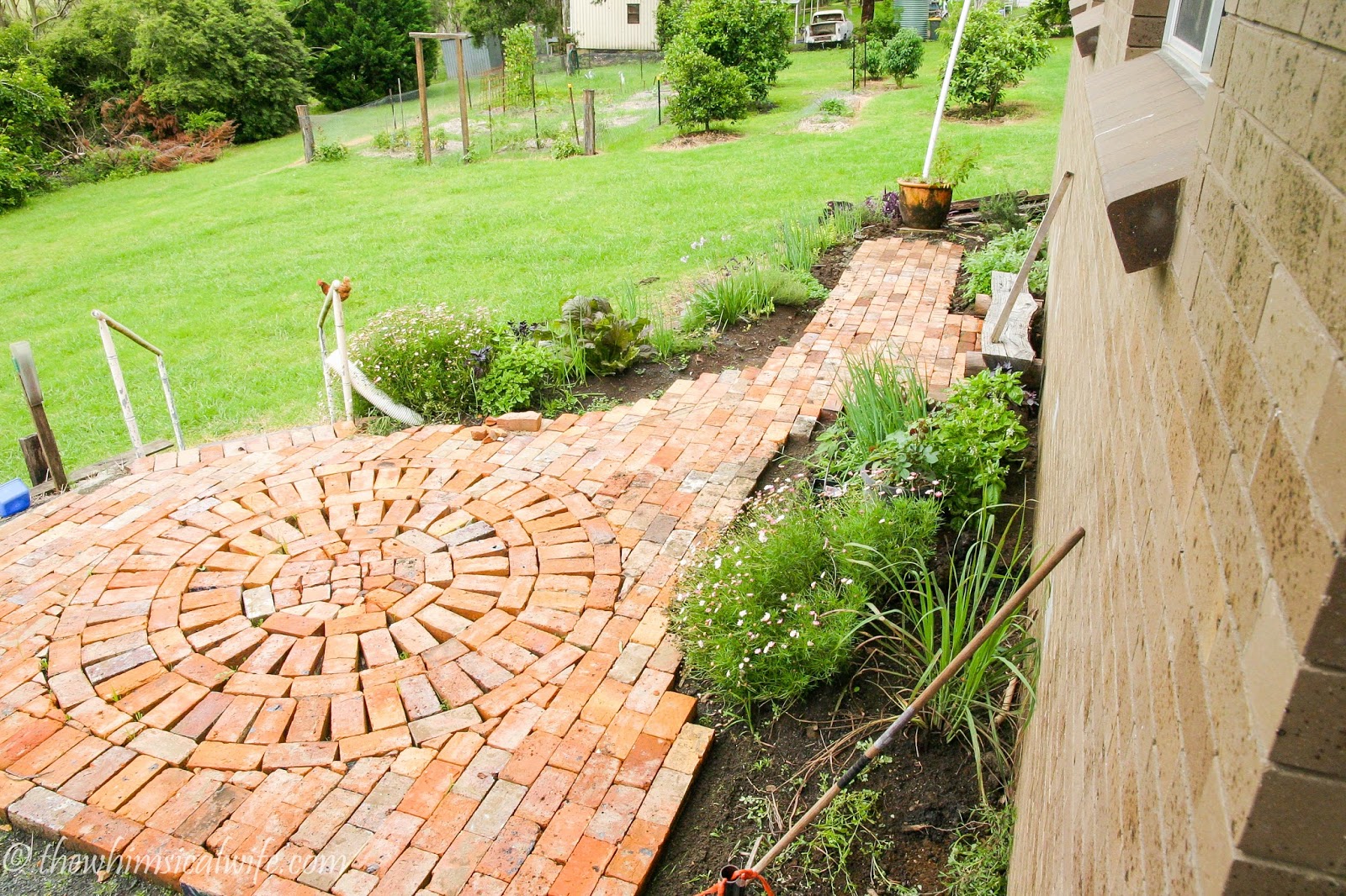 У меня сложилось впечатление, что эта площадка из кирпичей устроена прямо на земле, без фундамента. В наших условиях снегов и дождей я бы конечно сделала ее по принципу бетонной садовой дорожки — вынула сантиметров 15 грунта и залила фундамент из бетона. Важно для такой площадки и соблюсти уклон 1-2 градуса, чтобы талая вода весной и дожди осенью не застаивались.