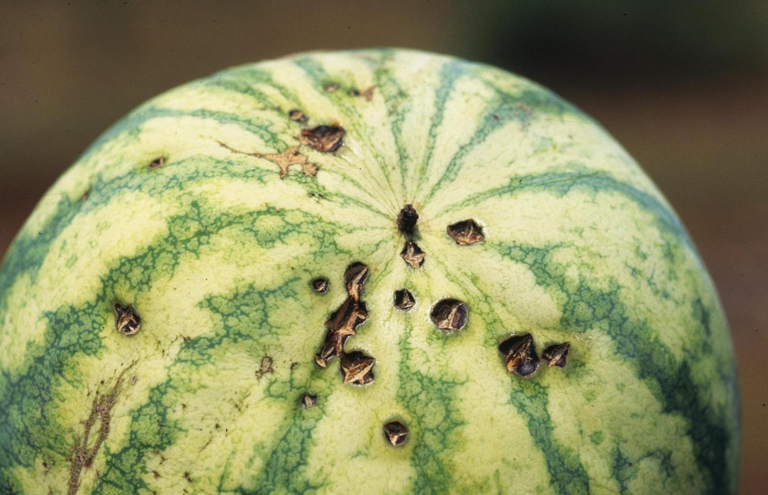 Угловатая пятнистость – последствие воздействия насекомых на арбузы. Вначале белесыми с сероватым отливом становятся листья, затем опадают ветви и стебли. Рост плодов при бактериозе прекращается, они становятся мягкими и прозрачными. Последняя стадия – арбуз становится белый полностью внутри. Рекомендуют ликвидировать весь куст, поскольку есть риски поражения семян.
