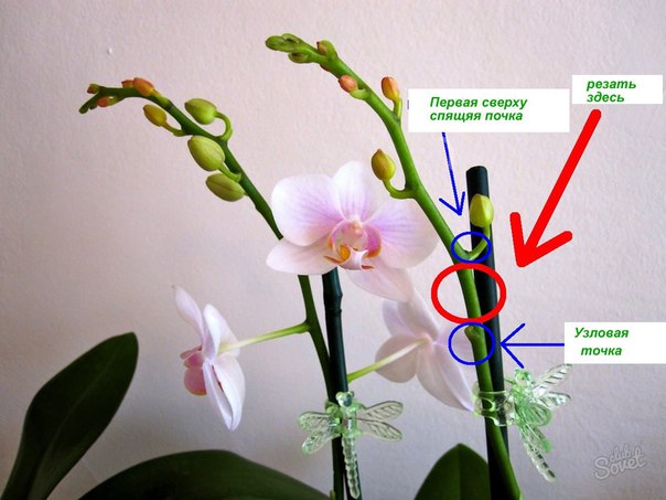 Уход за орхидеейВ идеале оставляют только побеги с растущими кончиками. Они могут дать новые бутоны. Если на цветоносах остались почки, срезайте над ними. Из почек вырастают цветоносы и детки.