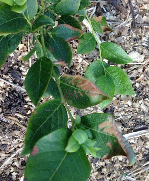 Если вы посадили на своем участке здоровые саженцы высокорослой голубики с зелеными листочками, а спустя пару недель заметили, что листовые пластины начали краснеть (причем не просто покрываться пятнами, а краснеть полностью, как осенью), значит, в почве низкий уровень кислотности. Голубика всех сортов предпочитает легкие кислые (3,5-4,5 pH) почвы и при недостатке кислоты меняет окраску листьев.
