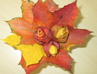 После сворачивания этого листа у вас должна получиться вот такая красивая розочка. Если вам покажется, что «лепестков» недостаточно, то можно обернуть бутон другими кленовыми листьями по той же схеме, что описана выше.