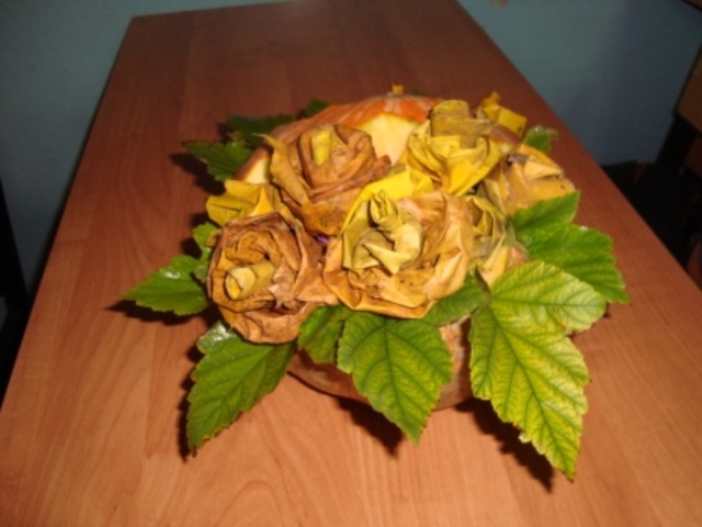 Делаются розы из листьев просто, для этого нужно согнуть кленовый лист пополам и свернуть его трубочкой, и так повторяем пока не сформируем розочку, готовый бутон закрепляем на проволоку.