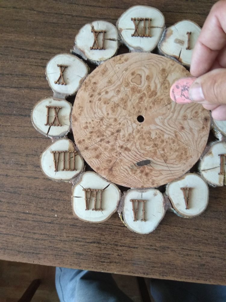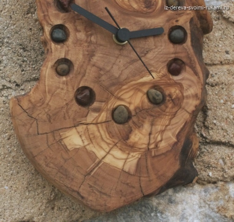 Далее одеваются стрелки, выставляется заданное время. Сам циферблат оформляется на усмотрение владельца: нарисованные цифры, бумажная основа, приклеенная к строго спилу, использование декупажных салфеток и т.д.