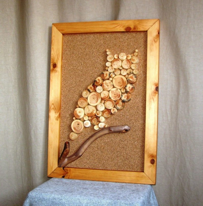Встретить панно можно из любых составляющих, но вы не видел полотно из деревяшек, правда? Здесь контрасты приветствуются, поэтому смело используйте даже пеньки. Картина должна иметь вид не паттерна, а полноценной композиции с доминантой и второстепенными элементами. Делайте тоновые градации, и расставляйте акценты с помощью тона. Конкретно для предложенного изделия лучше оставить кору — она сделает его привлекательнее. Небрежный рельеф создаст атмосферу бесконечного леса, и переместит вас в него.