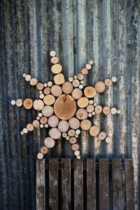Когда высохнет краска, можно будет разложить на щите спилы для примерки. При этом сверху и по бокам спилы должны выступать за края щита.Таким образом, щит будет замаскирован, а панно будет напоминать декоративную поленницу.