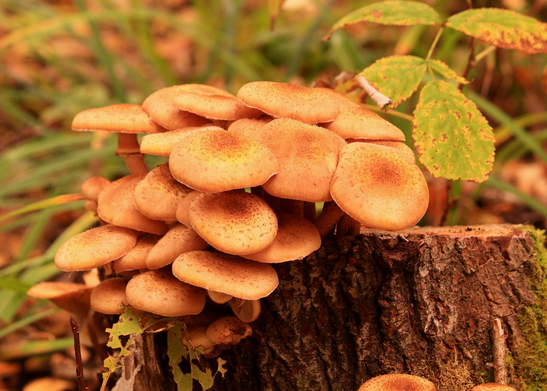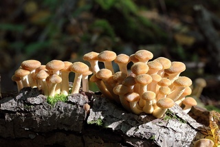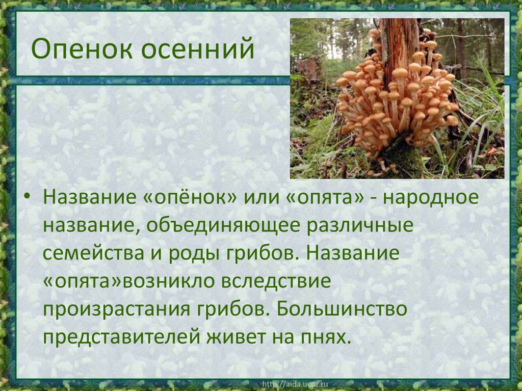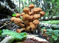 Опята — грибы пластинчатые с выпуклой шляпкой коричневого цвета, волнистые по краям и тонкая длинная ножка, покрытая хлопьевидными чешуйками.Грибы относятся к семье Рядовковых. Растут, как правило, небольшими группами, преимущественно на стволах живых деревьев и на пнях. Распространяют с помощью ползучих шнуровидных черных тяжей мицелий, которые иногда в длину достигают нескольких метров. Субстрат для обитания грибов обычно поражается белым грибком, вызывает постепенное гниение древесины и ее разрушение. Уничтожение мертвых деревьев и пней сопровождается интересным явлением — естественным свечением. Ночью деревья излучают мерцающий свет, пугающий опоздавших туристов.