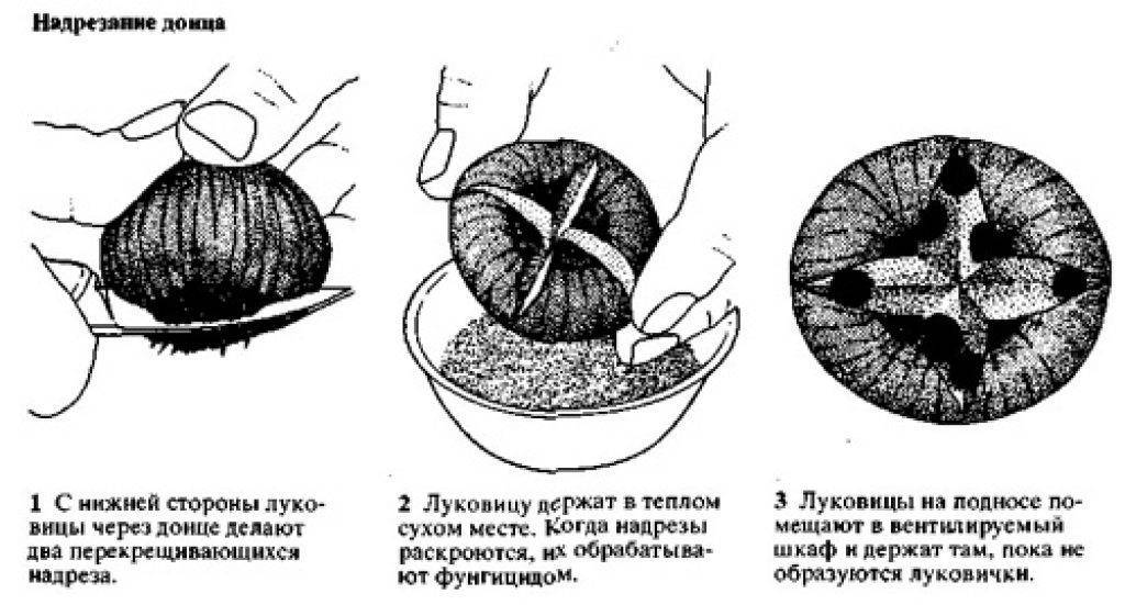 Когда пожелтеют листья (обычно в июне-июле), луковицы выкапывают, очищают от земли и укладывают в решетчатые ящики. В течение нескольких дней луковицы хранят в проветриваемом помещении без доступа прямых солнечных лучей (под навесом, в сарае). После этого луковицы очищают от старых чешуй и корней, отделяют хорошо сформировавшиеся детки, сортируют и укладывают на хранение. Хранят луковицы в течение первых 8 недель при температуре около +25 ºС. В это время происходит формирование будущего цветка. Затем температуру снижают до +17…+18 ºС. В таких условиях происходит развитие зачаточных корней и листьев.