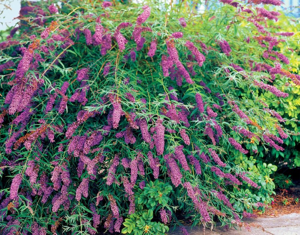 - Buddleja davidii ‘Ile de France’ — темно-фиолетовые цветки появляются с июля по сентябрь.