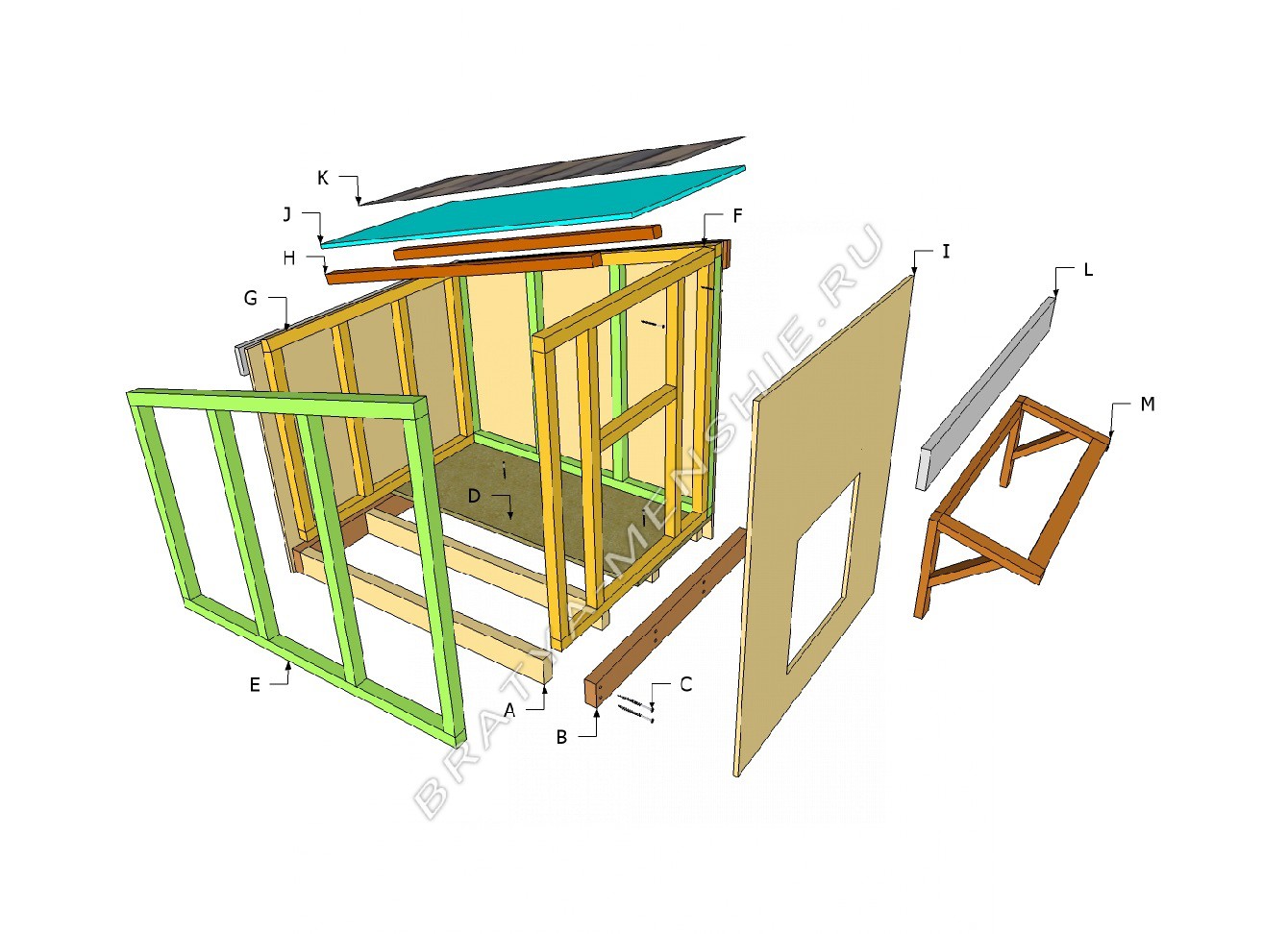 Сколачиваем каркас будки в соответствии с ранее приготовленным чертежом