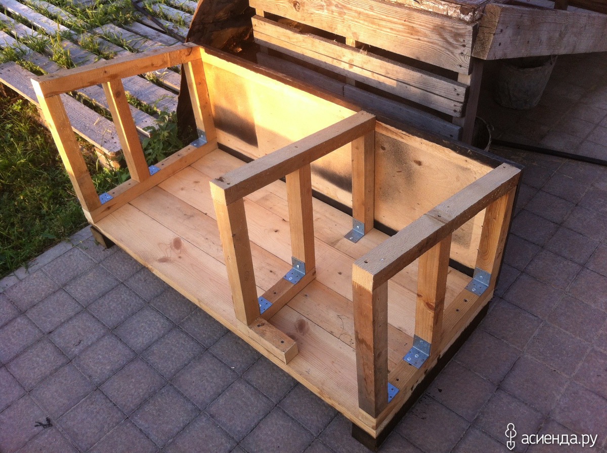 Потому что если крыша будет односкатной, то и боковые панели у нас должны быть непрямоугольными, так как у неё должен быть наклон для стекания воды, скат крыши должен уходить назад. Если же конура будет стоять где-то в вольере под навесом (о то как сделать вольер для собаки читайте здесь), то крышу можно делать без наклона. Для изготовления панелей берём бруски, нарезаем их по размеру и собираем четыре рамы, из которых мы будем делать стены. Крепление производим саморезами при помощи шуруповерта.