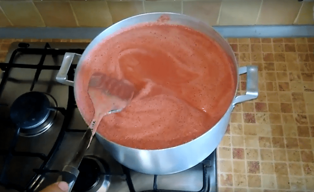 Когда сок начнет закипать, измельчите помидоры в картофелевидке.