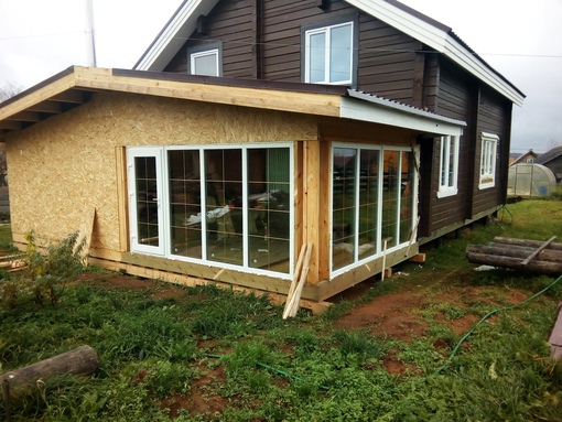 Прежде всего, веранда строится на заглубленном на глубину промерзании грунте фундаменте со всеми необходимыми подушками. Если есть такая возможность, выполняется подключение к существующему фундаменту, но не слишком жесткое.Для правильного соединения конструкций производятся обязательные расчеты.