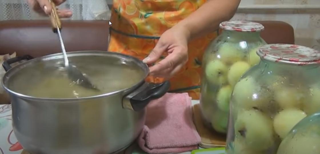 - Кипящим сиропом заполнять банки с яблоками так, чтобы вода стекла по стенкам. Таким образом жидкость вытолкнет наружу воздух.