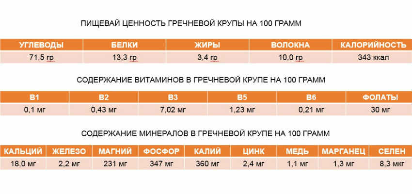 По составу зерно гречихи приближается к зёрнам хлебных злаков, но считается более полноценным, т. к. содержит значительное количество необходимых для организма человека альбуминов, глобулинов и сложных фосфорсодержащих белков (нуклеопротеидов), жиров, углеводов. Кроме того, ядро богато соединениями железа и витамином В1 (тиамином).