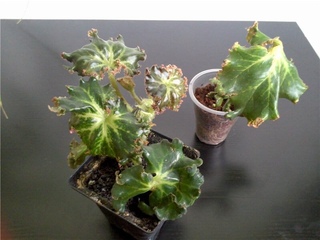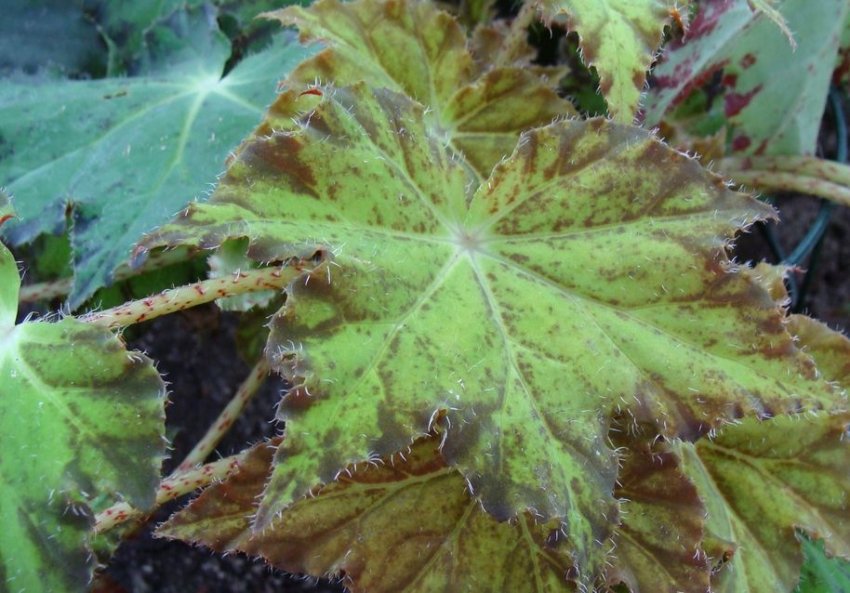 - Листовая нематода – это белые крошечные черви, атакующие листья и стебли бегонии. Сигнал бедствия – желтые пятна на листьях, которые буреют со временем, и деформированные верхушки побегов. При сильном поражении растение придется уничтожить.