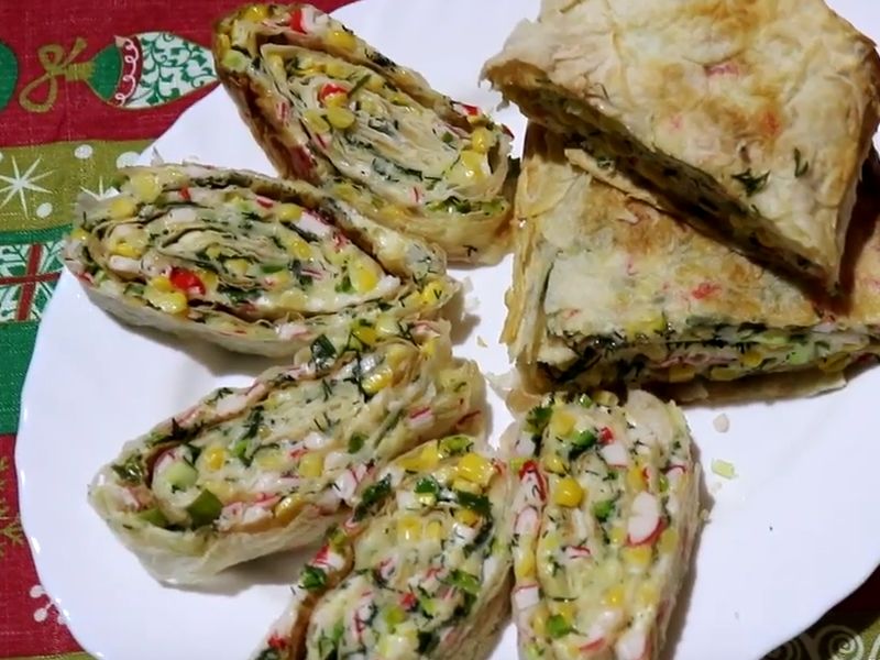1. Рулет из лаваша с крабовыми палочками и кукурузой