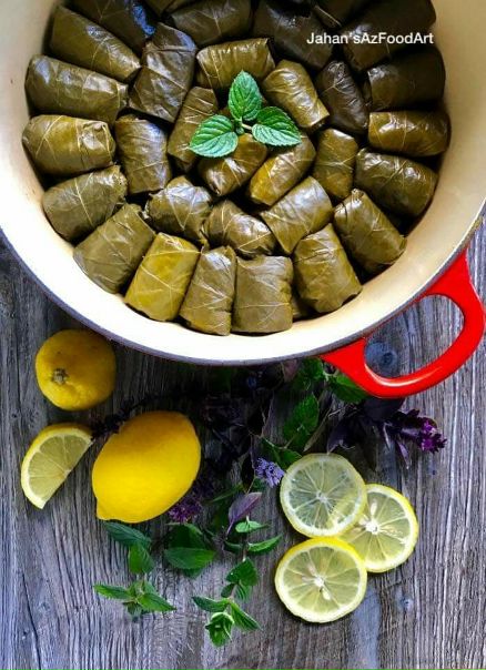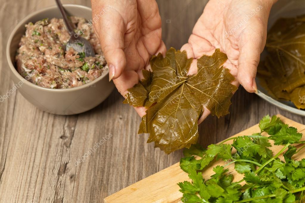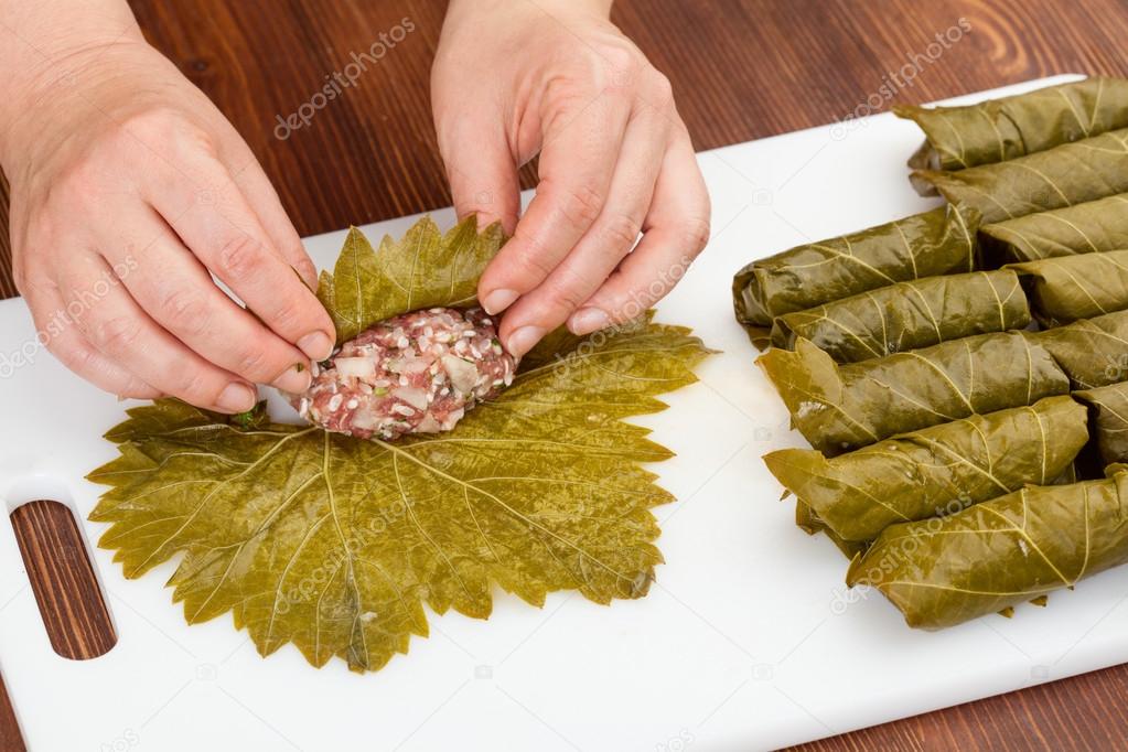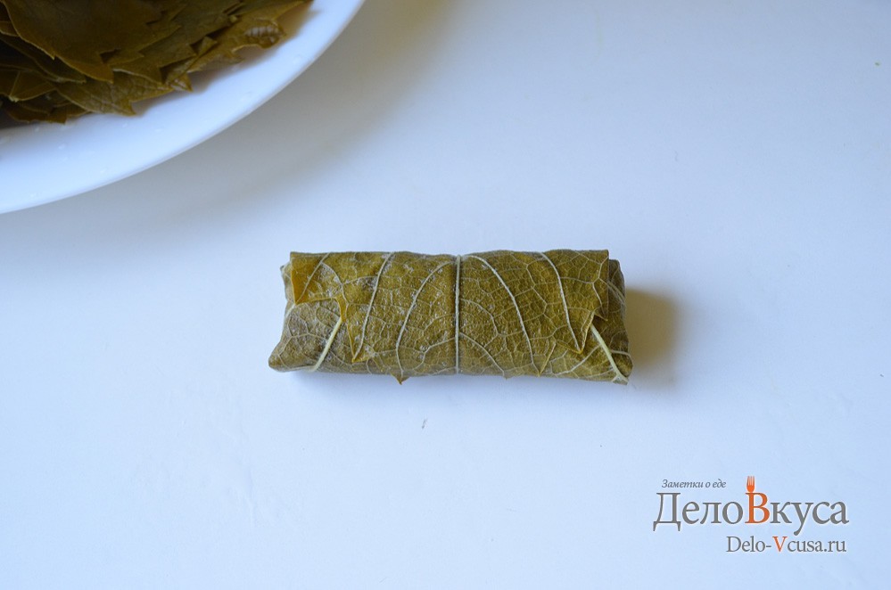 Положите 1 лист на рабочую поверхность стеблем вверх и положите 2 столовые ложки начинки в нижнюю середину листа.Сложите дно вверх, затем правую и левую стороны и плотно скатайте. Положить фаршированный лист в кастрюлю швом вниз. Повторите процесс с оставшимися листьями и убедитесь, что листья плотно прилегают к горшку. Смажьте листья ½ стакана масла, 1 стакан лимонного сока и 1 стакан воды.