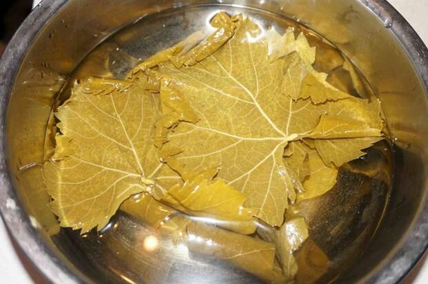- 7 л воды доводят до кипения в ёмкости с объёмом 10 литров. В эту воду закладывают виноградные, вишнёвые или смородиновые листья (выбор за вами, что конкретно вы желаете использовать). Листья хорошо толкут скалкой, чтобы они опустились на дно кастрюли. Далее кастрюлю снимают с огня, закрывают крышкой, укутывают в одеяло и оставляют на три дня.