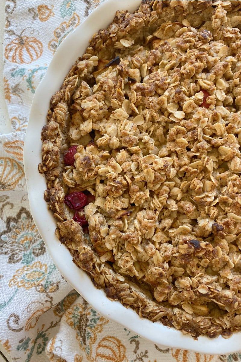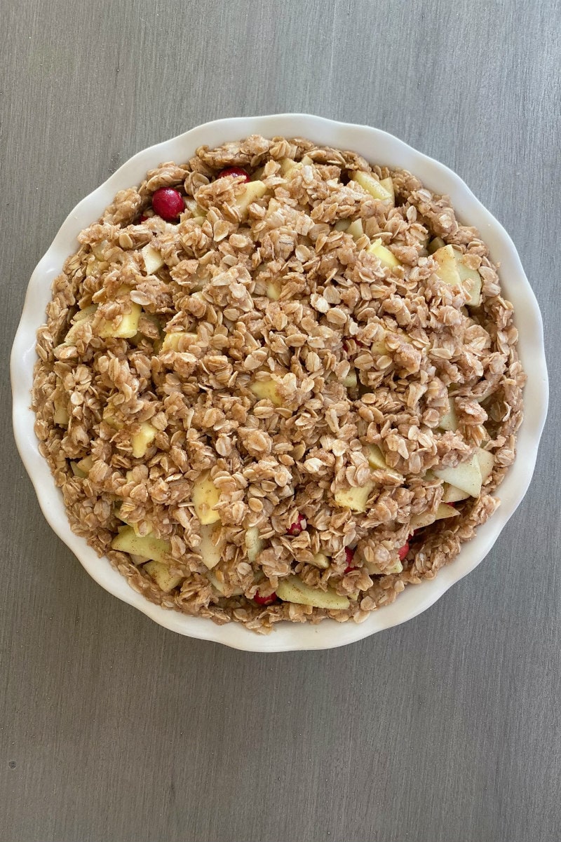 Яблоки и клюква заправлены лимонным соком и цедрой, а также приправлены специями, немного муки и небольшим количеством сметаны.Сверху посыпают более вкусные крошки из овсяного печенья.