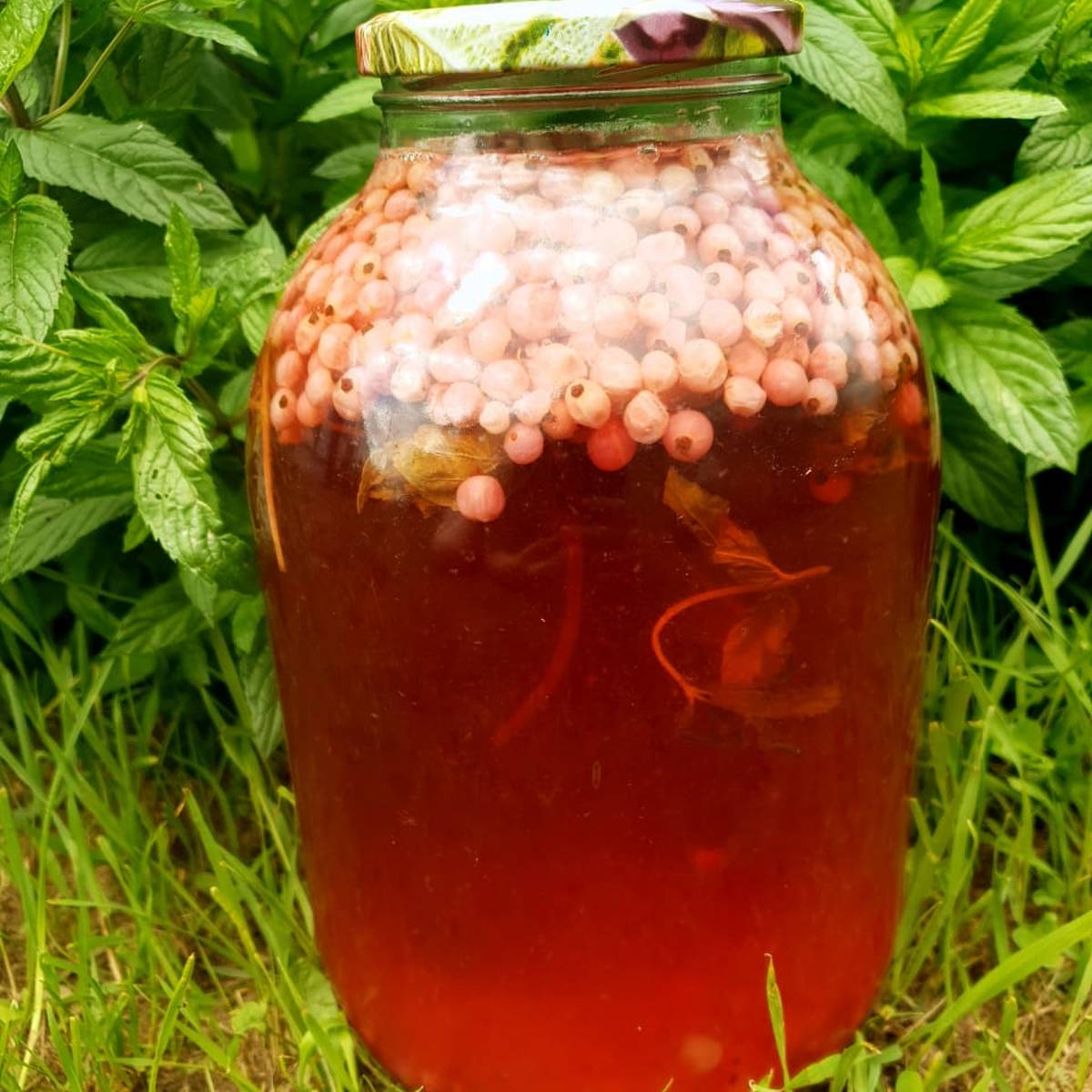 Компот с красной смородиной и ягодными листьями