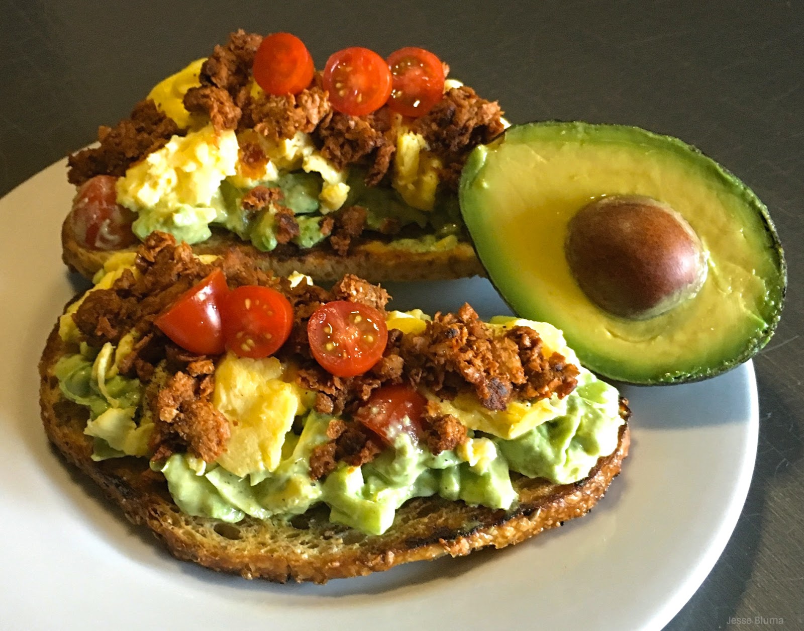 Это своего рода «перевернутые» гренки с авокадо: вначале авокадо покрываются крошками хлеба с чесноком, а затем сверху добавляется жареное яйцо.