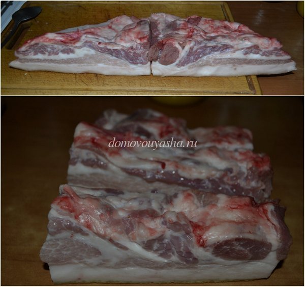 Для этого рецепта можно брать простое сало. Но намного вкуснее получится, если купить грудинку или бекон. Кусок следует промыть, просушить бумажным полотенцем и нарезать кусками 10-12 см в длину.