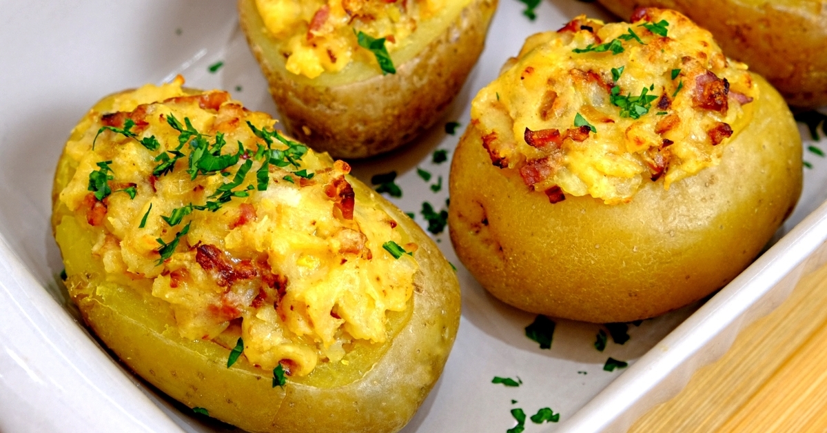 1. Картофель промыть и отварить в кожуре в течение 20 минут. Затем каждый картофель завернуть в бекон, в зависимости от размера вашего картофеля, Можно использовать целый ломтик или половину ломтика бекона.