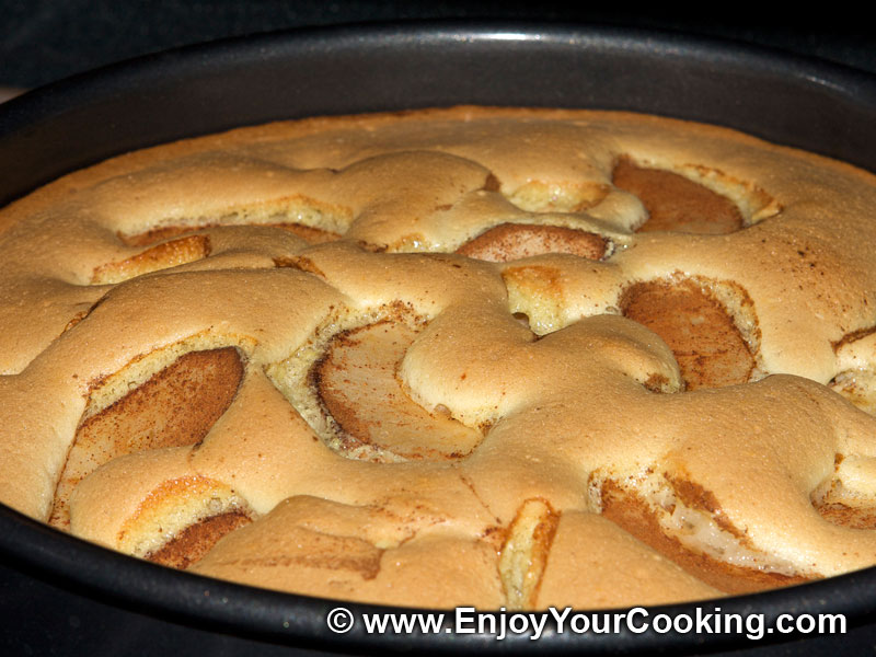 Для приготовления теста нужно: два яйца, 1 стакан кефира, 10 грамм мягкого сливочного масла, 1 стакан сахара, 1 чайная ложка разрыхлителя (соды гашенной), 1 стакан муки. Яйцо и сахар взбиваются в крутую пену, добавляется кефир, разрыхлитель, просеянная мука. Тщательно вымешивается тесто. Яблоки укладываются на дно формы и заливаются тестом. Выпекается 50-60 минут.