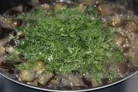 Пока баклажаны провариваются, порубите зелень и чеснок.