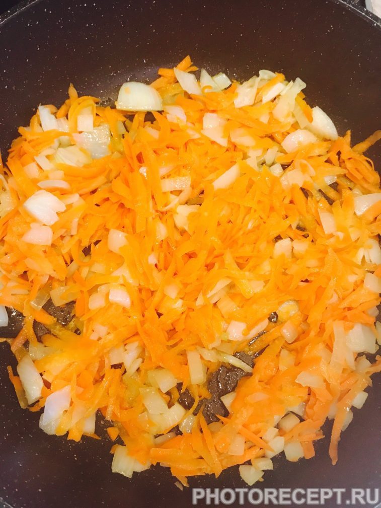 Тем временем на другой сковороде слегка обжарить лук и морковь. Морковь нарезать не очень тонкой соломкой, а лук — произвольно.