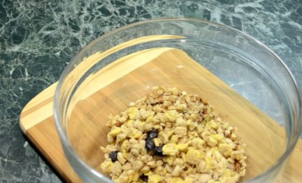 - Смешайте сахар, овес, специи и масло и залейте смесь ложкой в отверстие.