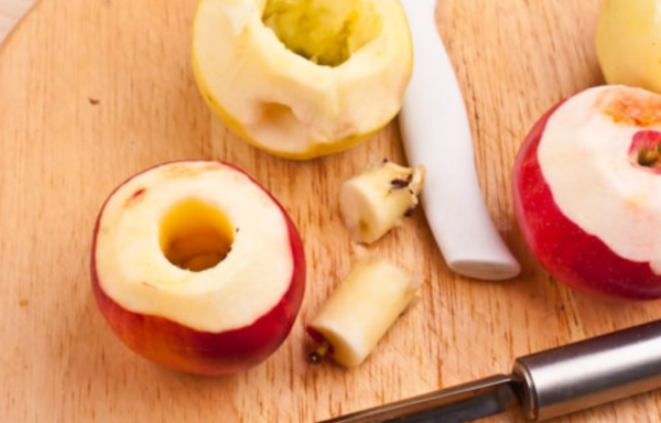 - Используйте ложку или инструмент для удаления косточек для яблок, чтобы удалить семена из середины яблок.