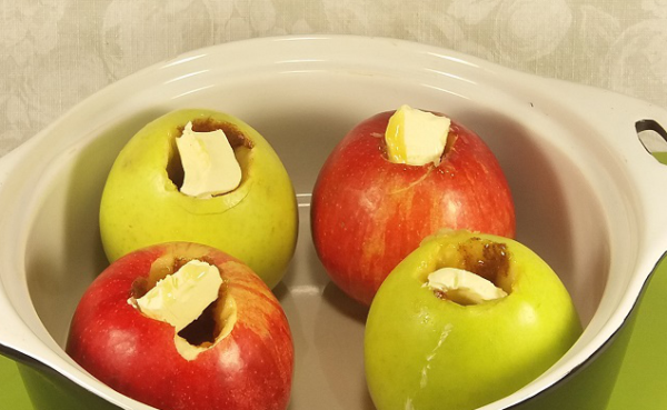 - Выложите яблоки в небольшую форму для выпечки и полейте каждое яблоко 1/4 столовой ложки сливочного масла.